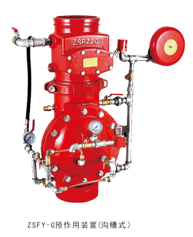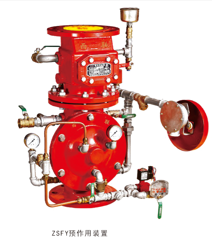 ZSFY型预作用装置是近几年发展起来的自动喷水灭火装置,它是将火灾自动探测报警技术和自动喷水灭火系统结合起来的预作用装置,对保护对象起双重保护作用、特别适用于寒冷冰冻和平时忌水渍,不允许出现误喷的重要场所,如计算机房、发电机房、资料室,史料档案馆、高架仓库场所。在未发生火灾时,该系统侧管路内充满压缩空气,故该系统具有干式系统的特点,能满足高温和严寒条件下自动喷水的需要。